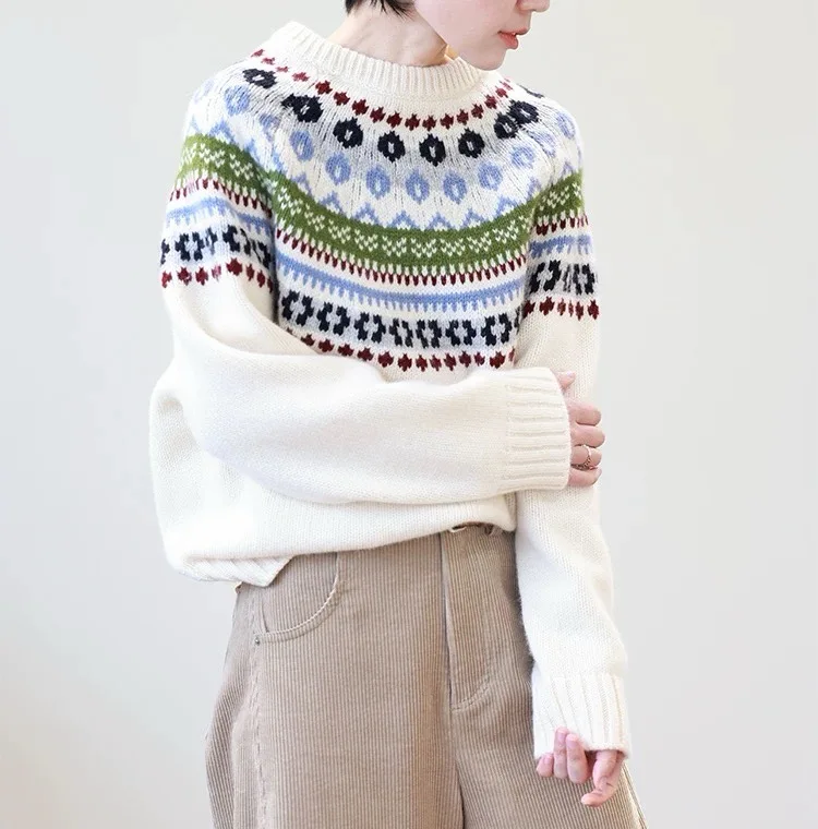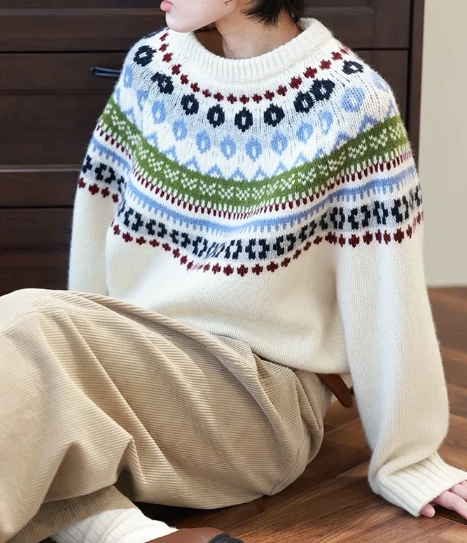 NARI Daily Women’s Oversized Crew Neck Fair Isle Wool Knitted Sweater Pullovers Korean Style Long Sleeved Heavy Warm Ski Sweater